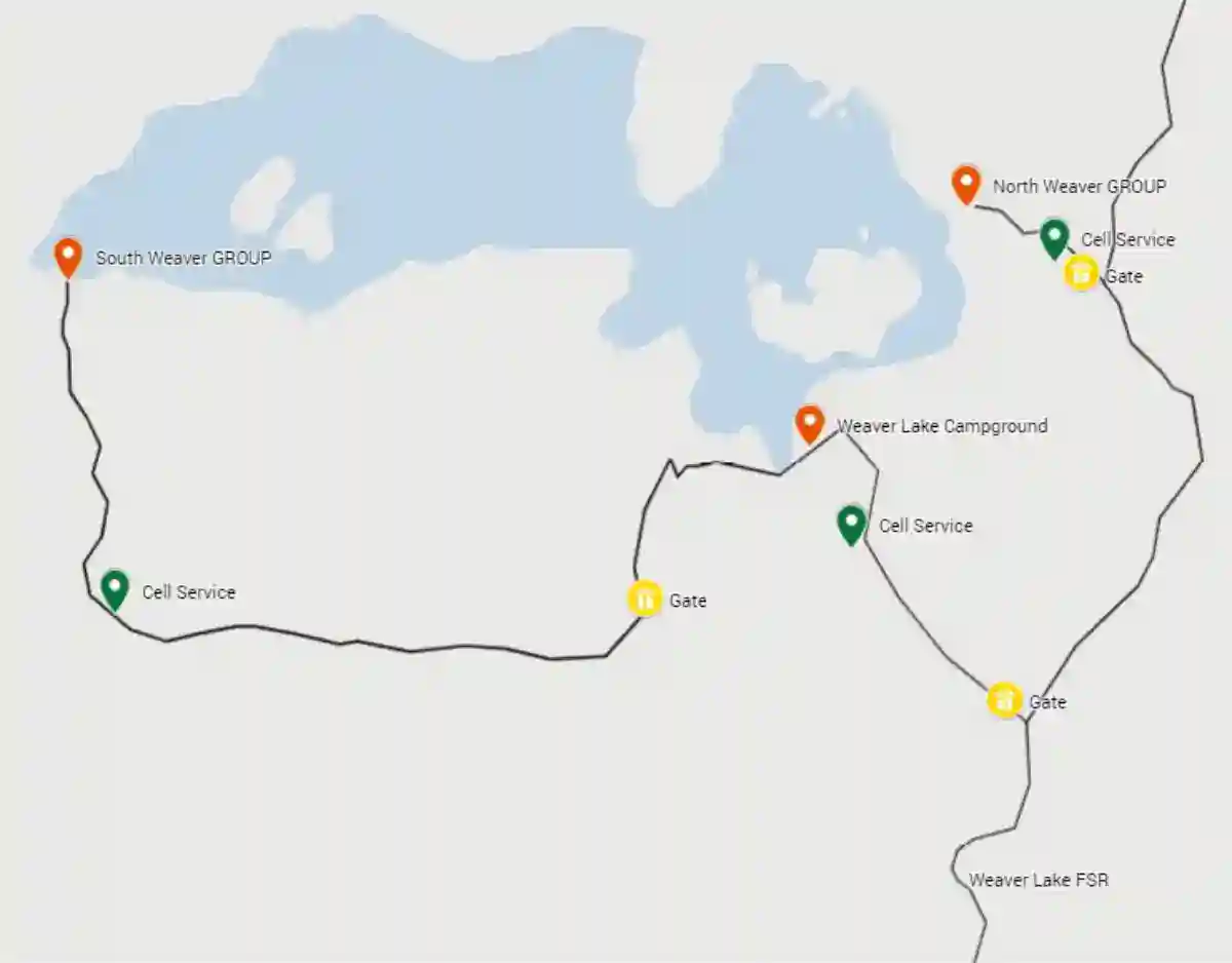 - Go right and travel another 1 km along the Weaver Lake FSR.