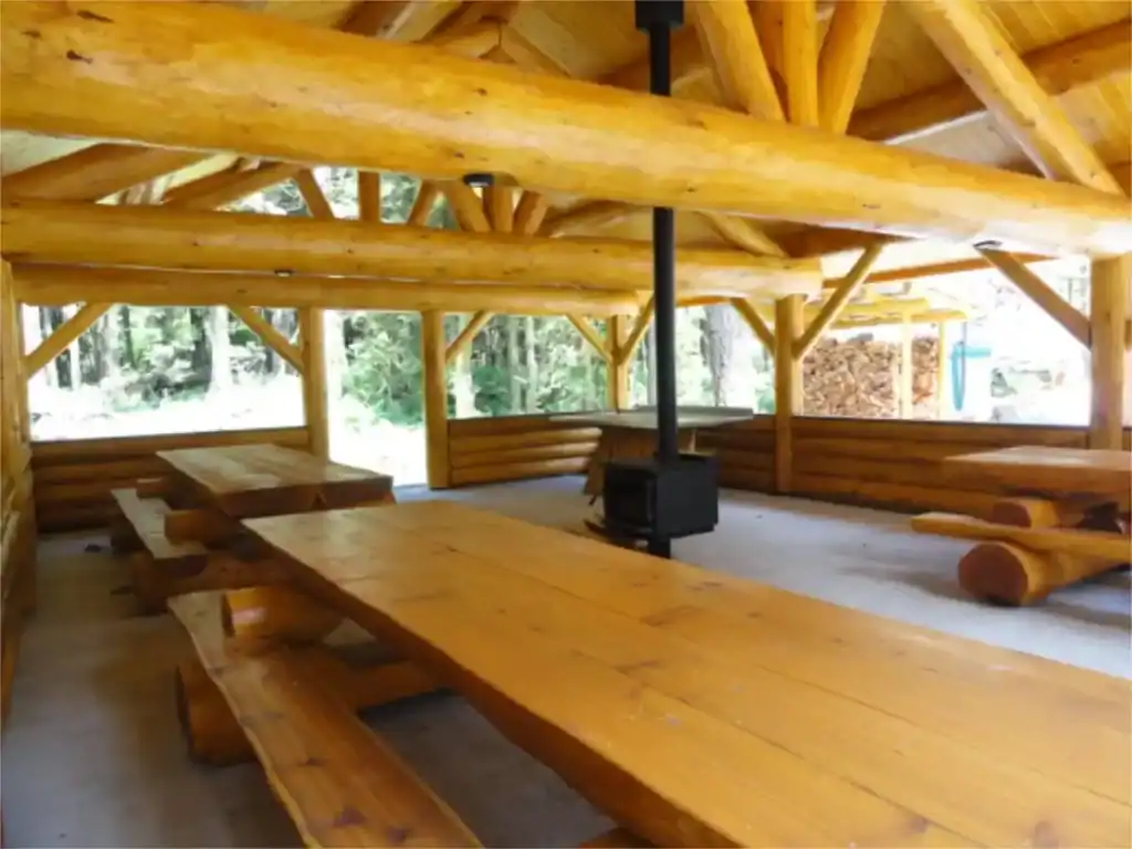 - A log shelter complete with wood stove, food preparation station and three beautiful log tables.